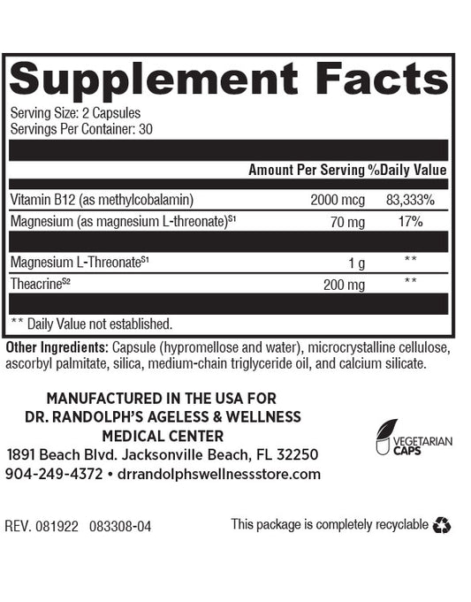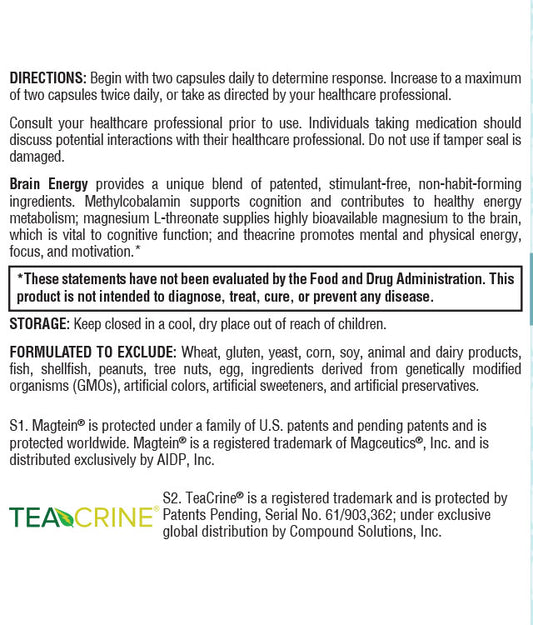 Brain Energy provides a unique blend of patented, stimulant-free, non-habit-forming ingredients. Methylcobalamin supports cognition and contributes to healthy energy metabolism; magnesium L-threonate supplies highly bioavailable magnesium to the brain, which is vital to cognitive function; and theacrine promotes mental and physical energy, focus, and motivation.