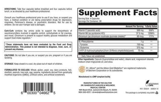 Carb-Curb contains key amino acids to support the biosynthesis of neurotransmitters involved in appetite control, carbohydrate or fat cravings, and mood. Chromium is present to support healthy glucose metabolism and support food intake regulation.