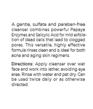 Formulated without parabens or sulfates, this cleanser is gentle enough for daily use, while being active enough to deliver skin brightening benefits to virtually all skin types. The combination of Papaya Enzymes and Salicylic Acid works to slough away dead skin cells. It effectively removes makeup and impurities found on the skin's surface, reviving dry and aging skin. It stimulates the production of new cells and delivers a brighter, clearer complexion, making this product an ideal addition to any regimen.