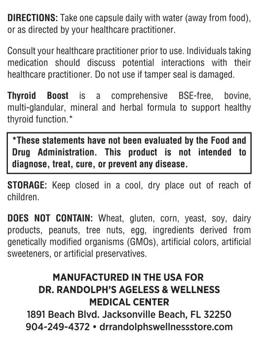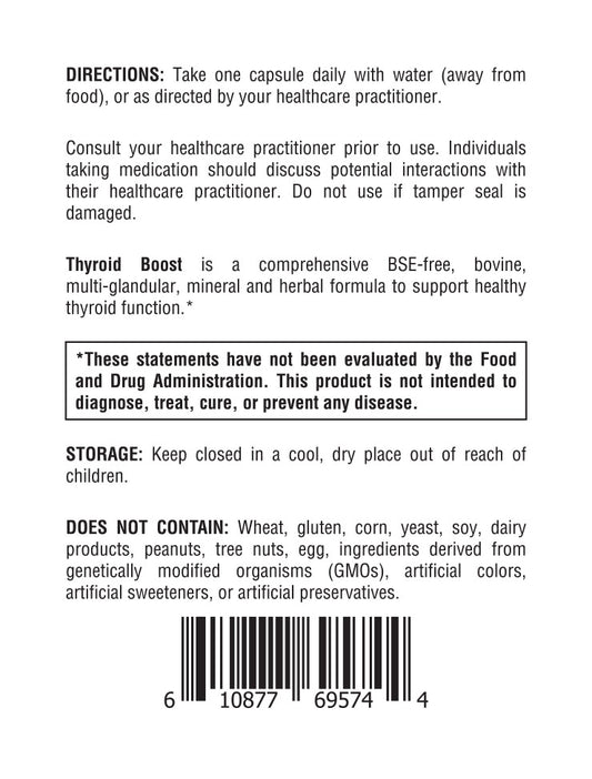 Thyroid Boost is a comprehensive freeze-dried, BSE-free, bovine, multi-glandular, mineral and herbal formula to support healthy thyroid function.