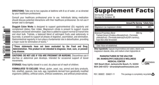 Sluggish Colon Works is designed to support gastrointestinal (GI) regularity and complement dietary fiber intake. Magnesium citrate is present to support muscle relaxation and bowel elimination.